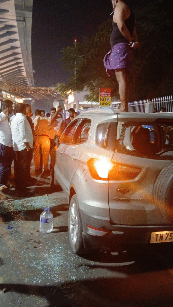 எனவே சாலையில் சென்ற இதர வாகன ஓட்டிகள் காரை சுற்றி வளைத்து வாலிபரை தாக்கினர். மேலும் காரின் கண்ணாடிகளையும் உடைத்து, அந்த வாலிபரை வாகனத்தில் இருந்து இறங்க செய்தனர்.