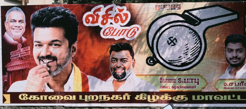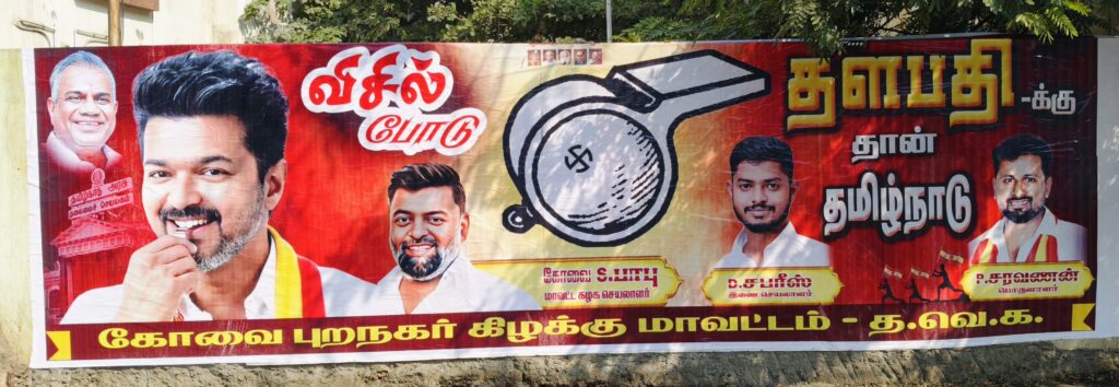 கோவையில் விசில் சின்னத்துடன் விசில் போடு தளபதிக்குத்தான் தமிழ்நாடு என த.வெ.க.வினர் ஒட்டியுள்ள பிரம்மாண்ட போஸ்டர்கள் கவனத்தை ஈர்த்துள்ளது.