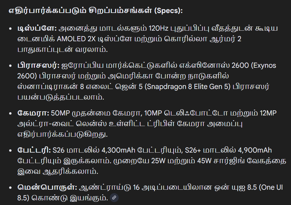 முன்னதாக, சாம்சங் நிறுவனத்தின் எந்தெந்த மாடல்கள் வெளியாகும் என்பது இன்னும் உறுதி செய்யப்படவில்லை. இருப்பினும், சாம்சங் கேலக்ஸி S26, சாம்சங் கேலக்ஸி S26+ மற்றும் சாம்சங் கேலக்ஸி S26 அல்ட்ரா மாடல்கள் வியாபார சந்தையில் மொபைல் பிரியர்களிடையே பெரிதும் எதிர்பார்க்கப்படுகிறது.