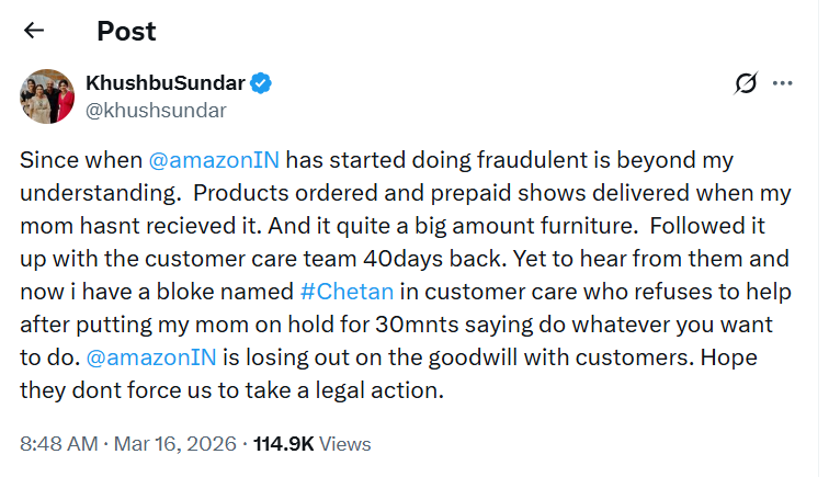 இந்த விவகாரம் தொடர்பாக சமூக வலைதளத்தில் பதிவிட்டுள்ள குஷ்பு, “அமேசான் இந்தியா எப்போது முதல் இவ்வாறான மோசடி செயல்களில் ஈடுபடத் தொடங்கியது என்பது எனக்கு புரியவில்லை. நாங்கள் முன்பே பணம் செலுத்தி ஆர்டர் செய்திருந்த பெரிய அளவிலான ஃபர்னிச்சர் பொருள், என் அம்மாவிடம் வந்து சேரவில்லை. ஆனால், அமேசான் தரப்பில் அது டெலிவரி செய்யப்பட்டுவிட்டதாக காட்டப்பட்டுள்ளது” என்று தெரிவித்துள்ளார்.