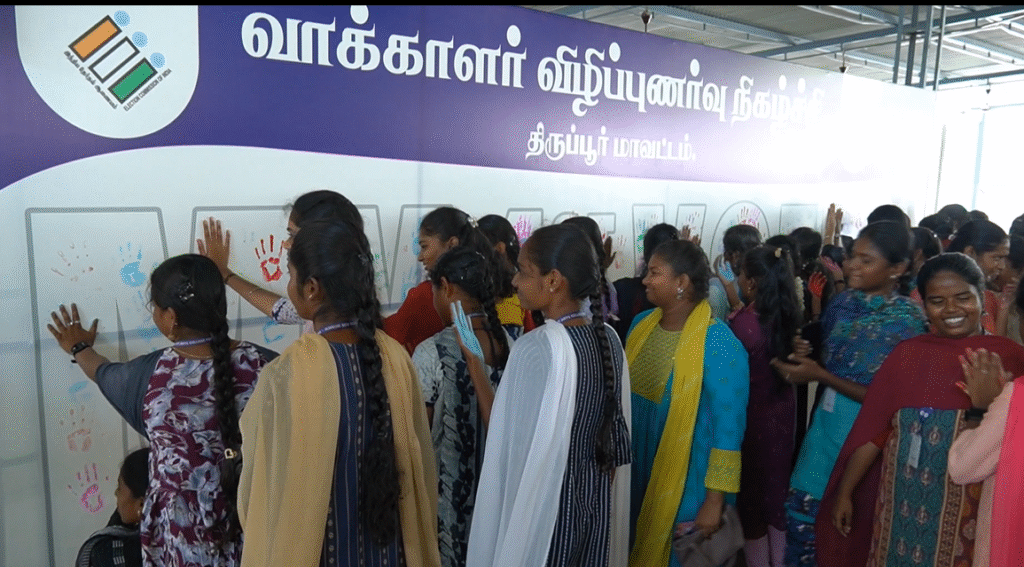 வரும் சட்டமன்றத் தேர்தலை முன்னிட்டு திருப்பூர் மாவட்ட நிர்வாகம் மற்றும் தேர்தல் ஆணையம் சார்பில் மாவட்டத்தில் பல்வேறு 100% வாக்குப்பதிவை வலியுறுத்தி விழிப்புணர்வு நிகழ்ச்சியில் நடைபெற்று வருகிறது.