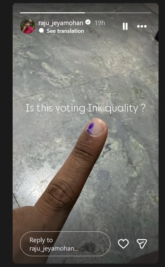 அந்த வகையில், வாக்கு பதிவு முடிந்த பிறகு பிக் பாஸ் ராஜூ ஜெயமோகன் ஒரு அதிர்ச்சி குற்றச்சாட்டை முன் வைத்துள்ளார். கையில் வைத்த மை தரம் சரியில்லை என அவர் கூறியிருக்கிறார். இது தான் ink தரமா என ராஜூ ஜெயமோகன் கேள்வி கேட்டிருக்கிறார்.